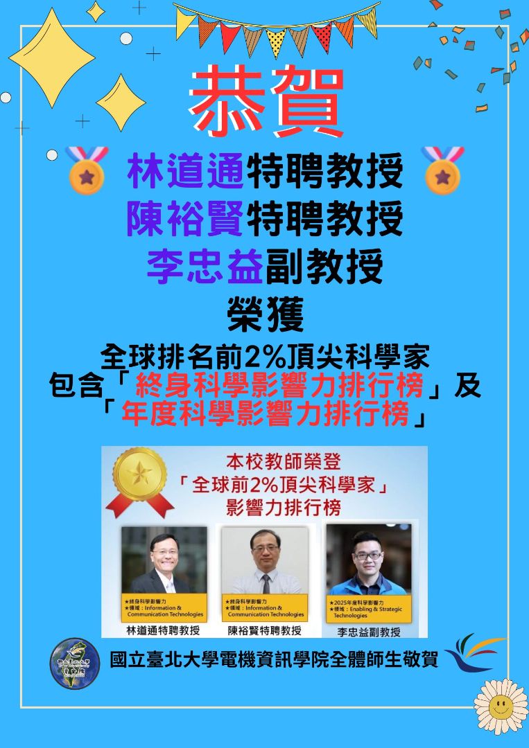 林道通特聘教授陳裕賢特聘教授李忠益副教授榮獲全球排名前2%頂尖科學家包含「終身科學影響力排行榜」及「年度科學影響力排行榜」