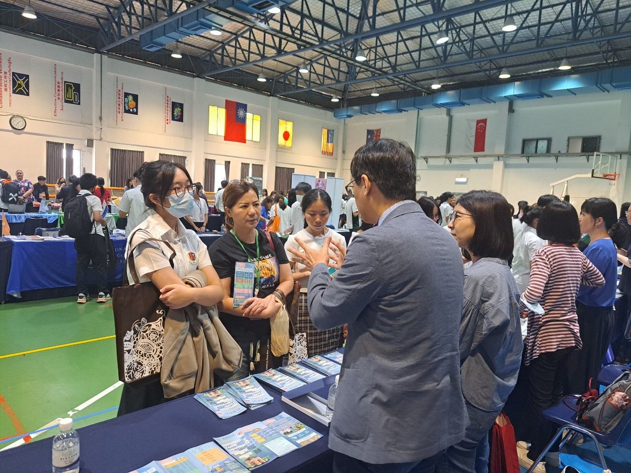 教育展首站於泰國中華國際學校(Thai-Chinese International School,簡稱TCIS)室內體育館舉行,現場吸引逾300名國高中生及其家長到場參與。TCIS的特色是以中、英、泰三國語言教學,以提升學生在國際上的競爭能力。現場邱主任不僅僅對學生和家長詳細講解本校各學院及全英語永續創新國際學院各學程之特色、立足北臺灣的地理優勢與優美校園環境、申請方式與學校對外籍生良好的照顧外,更播放國際處聘請臺灣獨立製片辛建宗導演所拍攝的 ”A Day of My Life at NTPU”系列影片,幫助泰國學生透過影像了解在本校求學的日常點滴。