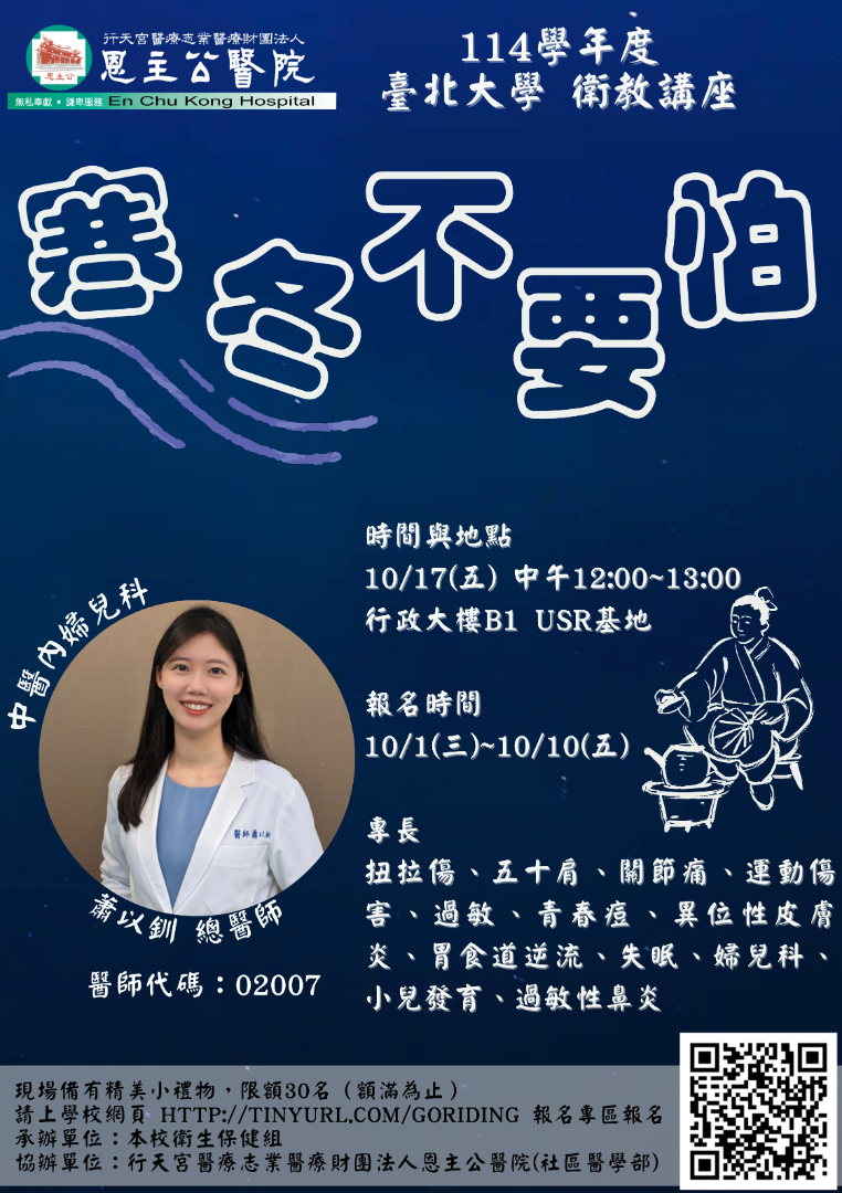 冬季是養藏的重要時節,許多人在冷空氣來襲時常感到手腳冰冷、精神疲倦。為協助大家提升抵禦力、調養體質,本次特別邀請中醫師分享冬季養生之道,透過簡單的方法強健身心,不僅能有效禦寒,更能為來年的健康奠定良好基礎。