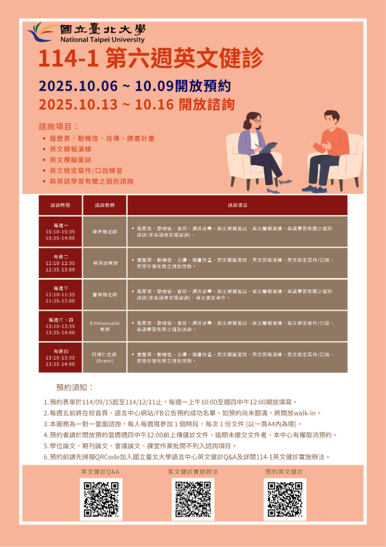 114-1 【第六週英文健診】開放預約中,歡迎同學報名預約。