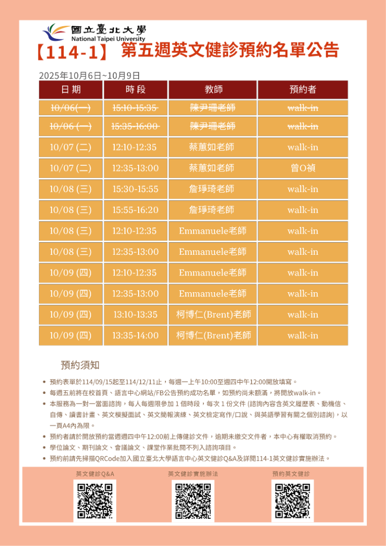 【語言中心】114-1 第五週英文健診預約名單公告,無人預約的時段當日提供walk-in。