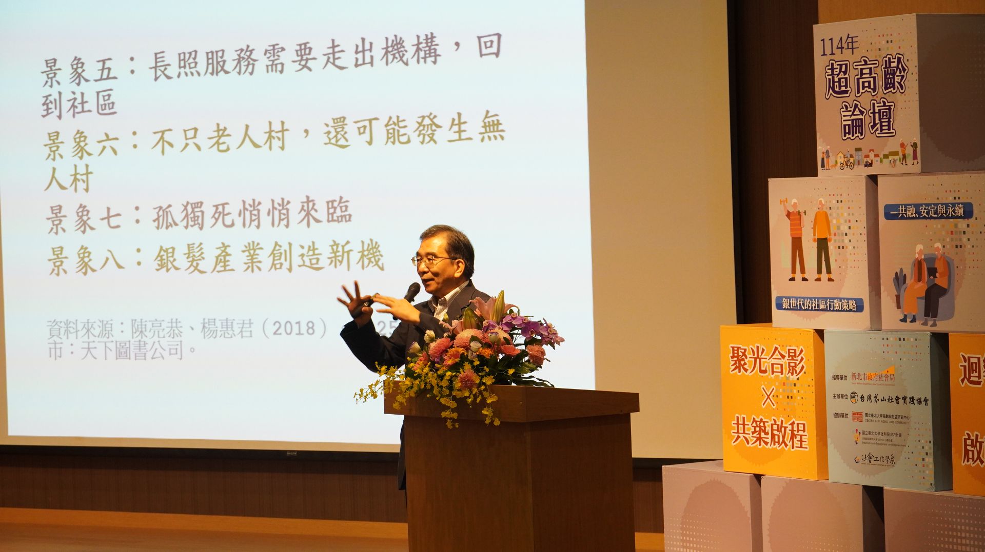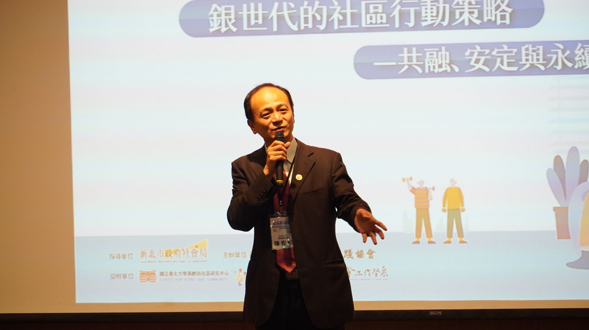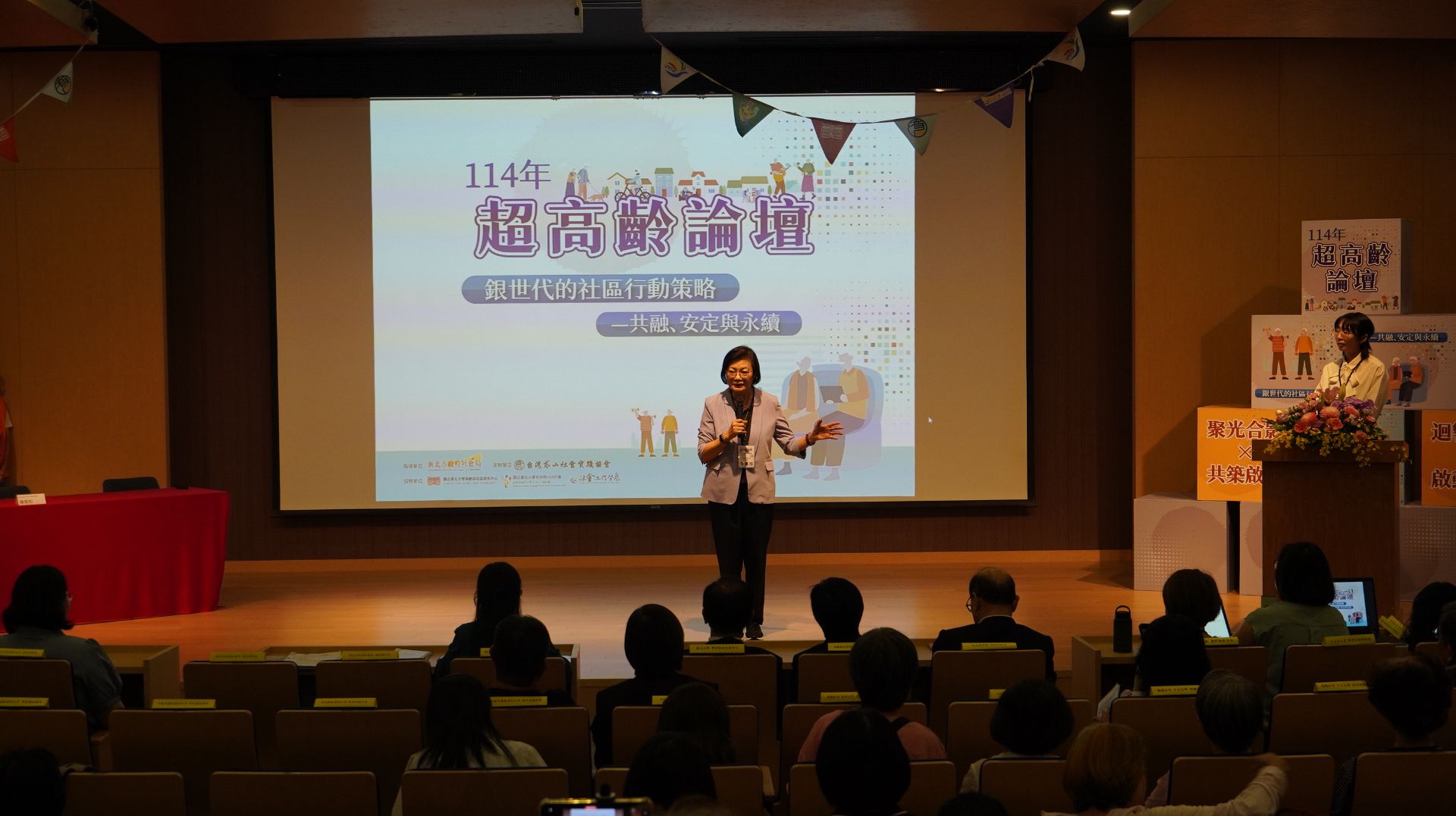 論壇現場氣氛熱烈,與談貴賓分別從政策、實務與教育面向分享如何促進高齡友善社區的行動策略,並以「共融力、安定力、永續力」為三大討論主軸。「專題演講」由社科院林昭吟院長主持,邀請國立東華大學民族發展與社會工作學系賴兩陽教授,分享超高齡社會的趨勢,他也提出長照與社區照顧結合的可能性,以及未來應善用AI與志願力,作為銀世代持續學習與社會參與的行動指南。