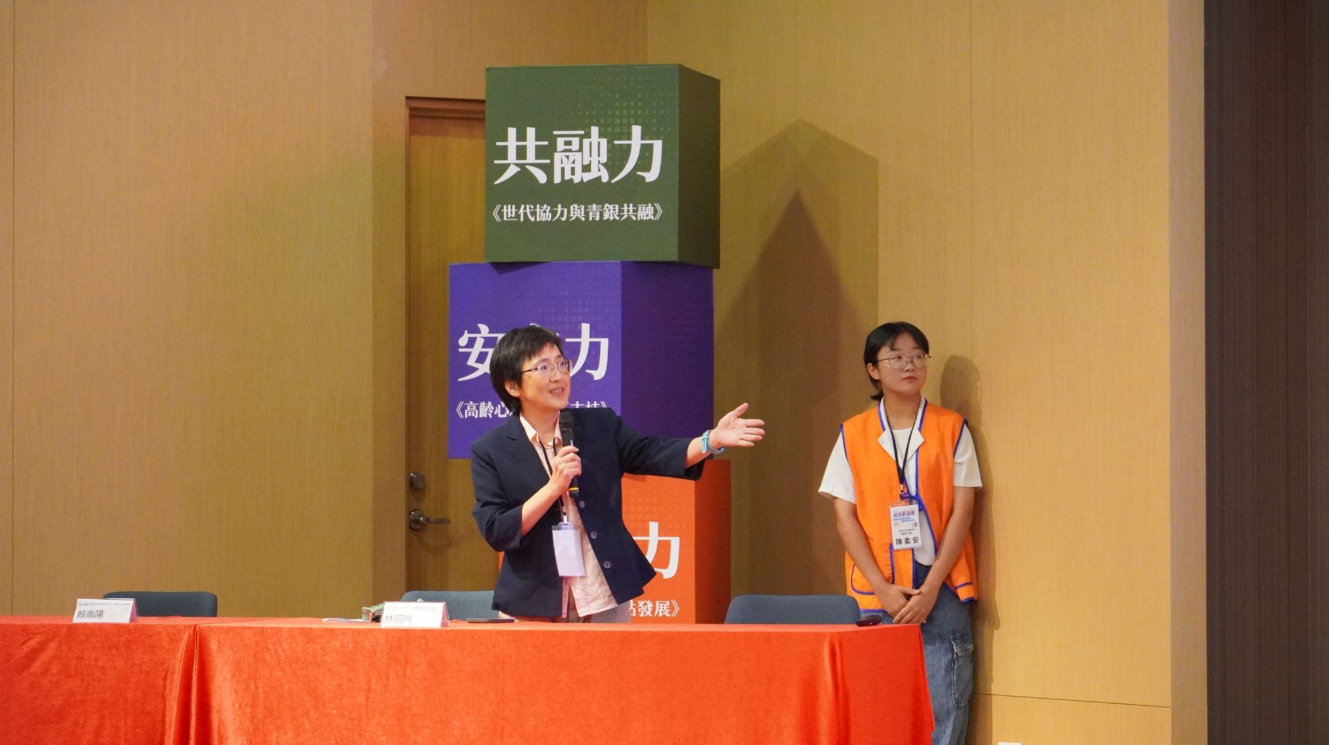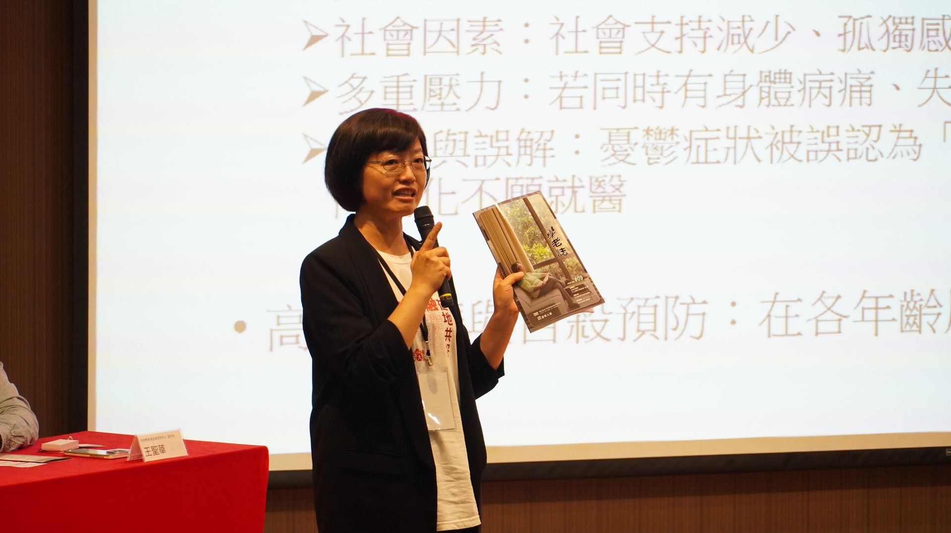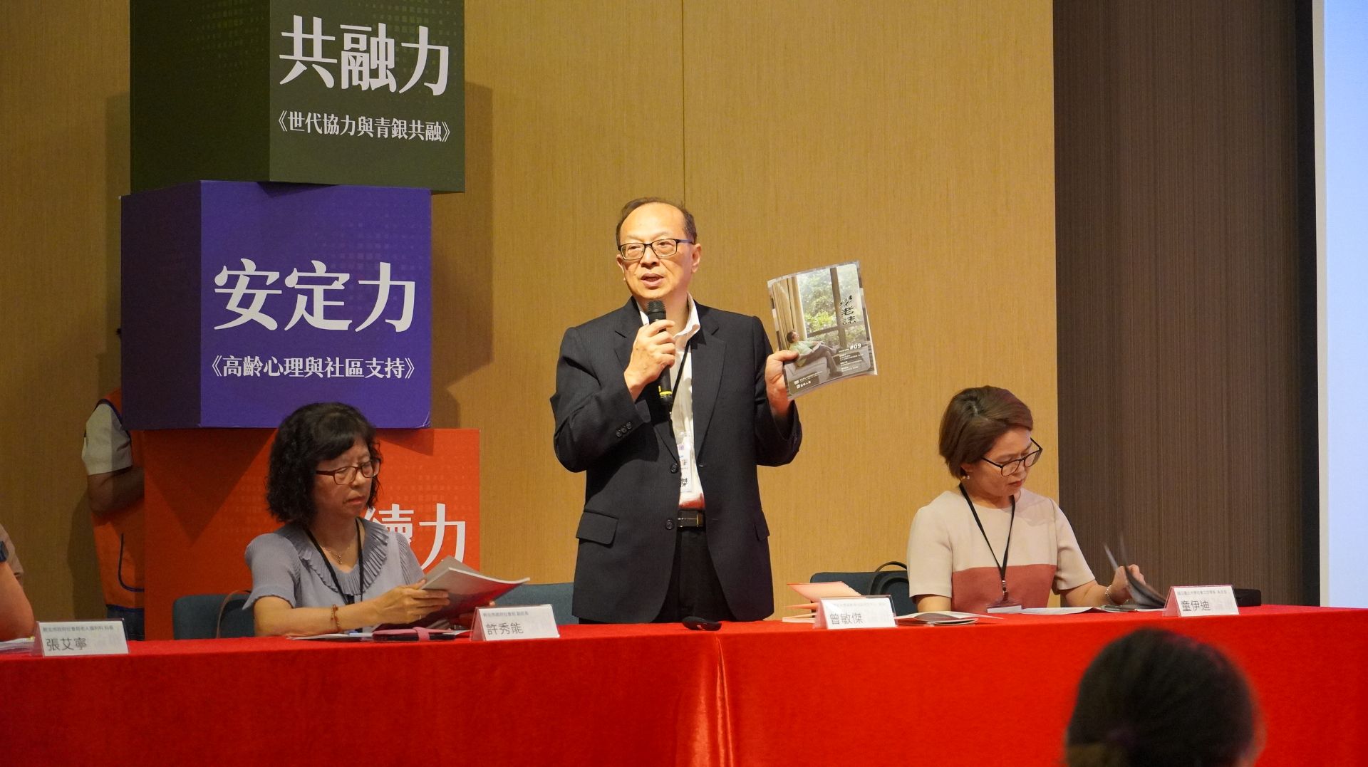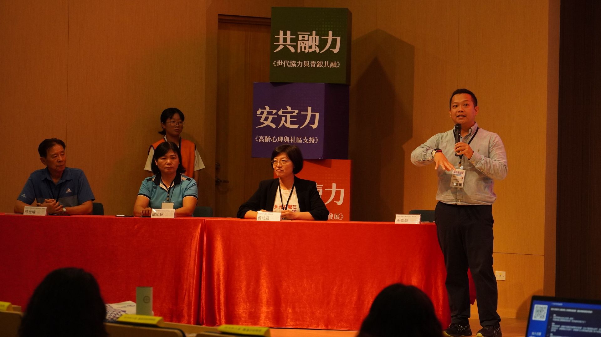 而在當天「共融力、安定力、與永續力」三個場次當中,尤其以「安定力」的討論最能與第九期《學老誌》的內容相呼應。「安定力」的場次強調高齡心理與社區支持,由任林教育基金會諮商中心王聖華副所長主持,邀請東吳大學心理學系曾幼涵助理教授引言。曾教授指出高齡憂鬱罹患者的就診率僅約1.3%,並表示她在主持校內USR計畫時,曾經辦過「好心情練功坊」接觸不少社區長者,發現長者不是不願意求助,而是需要熟悉與信任感,才能讓諮商專業有介入的機會;由於社區據點具有讓長者安定的角色,如果透過據點將專業服務輸送進入社區,將可以成為高齡情緒健康的第一張安全網。而主持人王聖華副所長也表示,憂鬱症應該要去病名化,據點的功能不僅能預防高齡憂鬱,也能有療癒高齡者的能量。