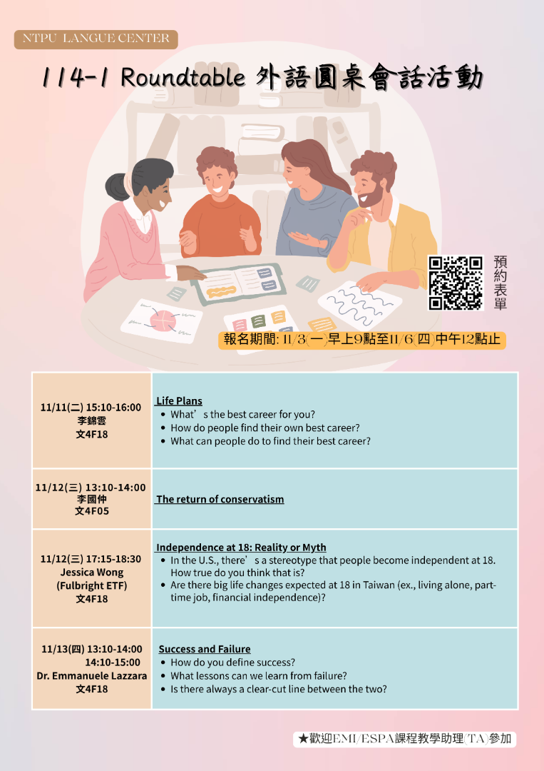 【語言中心】114-1 Roundtable 外語圓桌活動 預約公告(11/11, 11/12, 11/13)