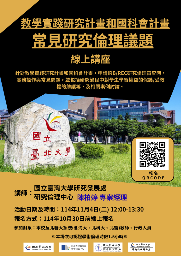 【研究倫理】114年11月4日「教學實踐研究計畫和國科會計畫常見研究倫理議題」線上講座