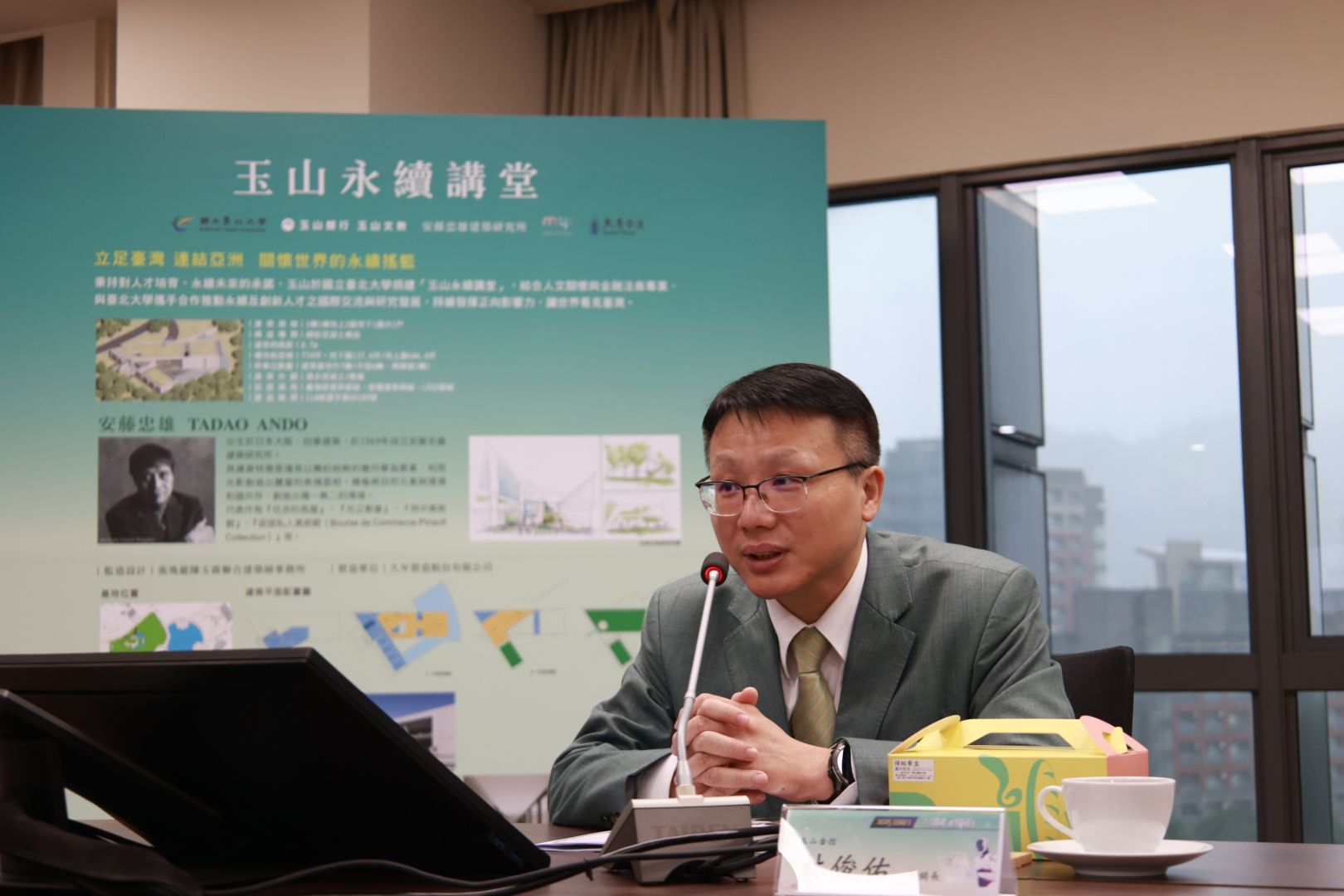 林俊佑也提到當初玉山永續講堂的選址和規劃過程,安藤先生詳盡地透過玉山及臺北大學團隊,了解校地概況、空間使用,以及最重要的未來使用願景,並且和臺灣的建築團隊分享經驗。安藤先生希望這座講堂,能讓臺灣及世界各地的人們展開對話,共同思索所處的環境,關注人類及地球的未來,使講堂成為此⼀理念的核心所在。