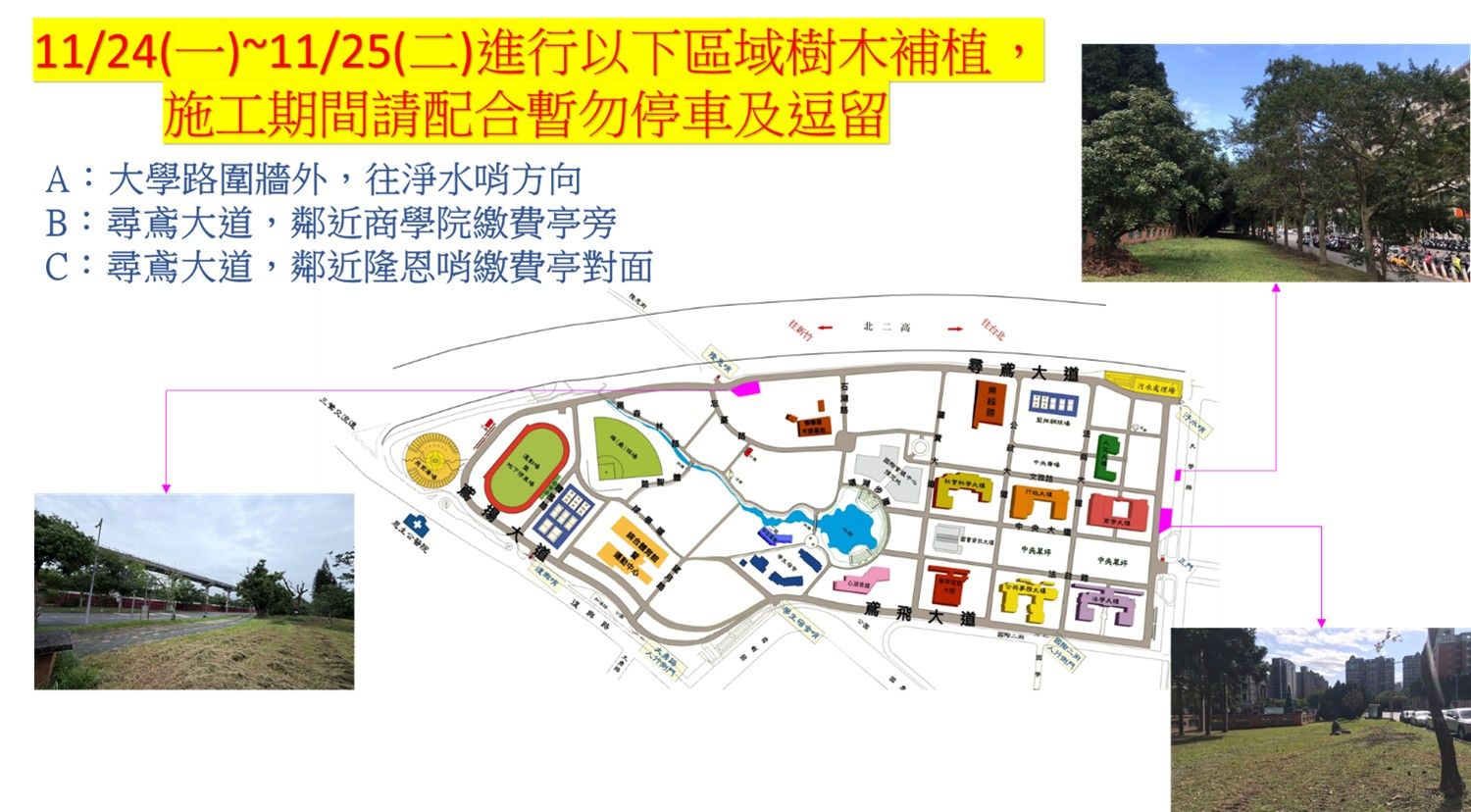 旨揭工程謹訂於114年11月24日(一)~11月25日(二) 進行校樹補植作業,期間將有大型工程車進出校園。大學路圍牆外往淨水哨方向、尋鳶大道(鄰近商院停車繳費亭旁綠地、隆恩哨停車繳費亭對向綠地(如下圖標示區域)等施工區段,請在校師生及社區居民配合「切勿將車輛停放鄰近區段之汽車停車格」,另亦請配合不要靠近施作區域,並儘可能離開現場,以利植樹作業順利進行及確保自身安全,施工期間將責請施工廠商妥善做好交維措施及工區管制作業,過往車輛及行人請小心通行,施作期間造成噪音及通行不便,敬請見諒。基於施工安全,如遇風雨將暫停施作,不另公告,屆時請來往行人與車輛多加留意。
