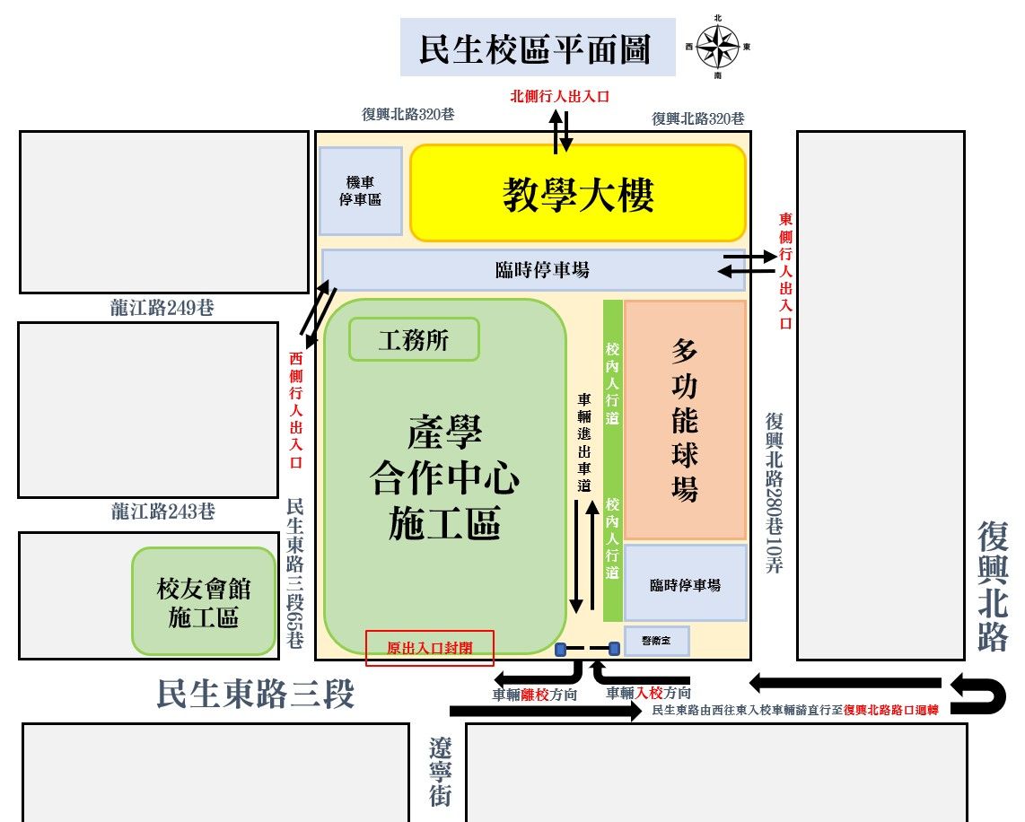 二、11月21日以後,由西向東車輛無法由民生東路左轉遼寧街進入校區,請往前行駛至復興北路迴轉民生東路三段由新出入口進入。