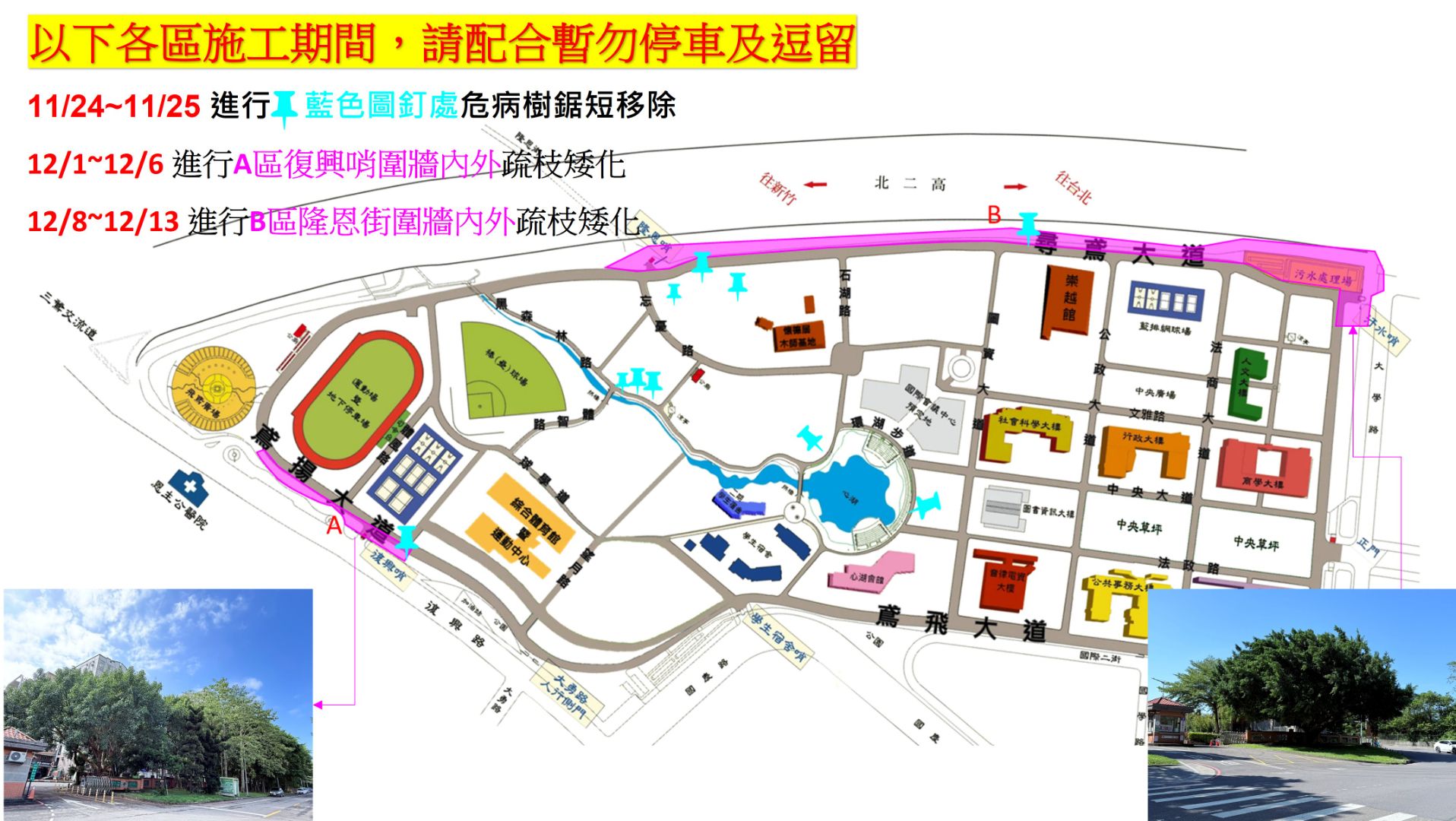旨揭工程謹訂於114年11月24日(一)~12月13日(六)進行鳶揚大道(復興哨至體育館暨地下停車場段)、尋鳶大道(隆恩哨至淨水哨段)圍牆內外樹木疏枝矮化(如下圖粉色區塊區域)、校內其他各區危病樹鋸短移除(如下圖水藍色圖釘處),期間將有工程車進出校園,請在校師生及社區居民配合勿將車輛停放鄰近區段之汽機車停車格,以免樹枝掉落不慎造成車損,另亦請配合切勿靠近施作區域,並儘可能離開現場,以利施作及確保自身安全。