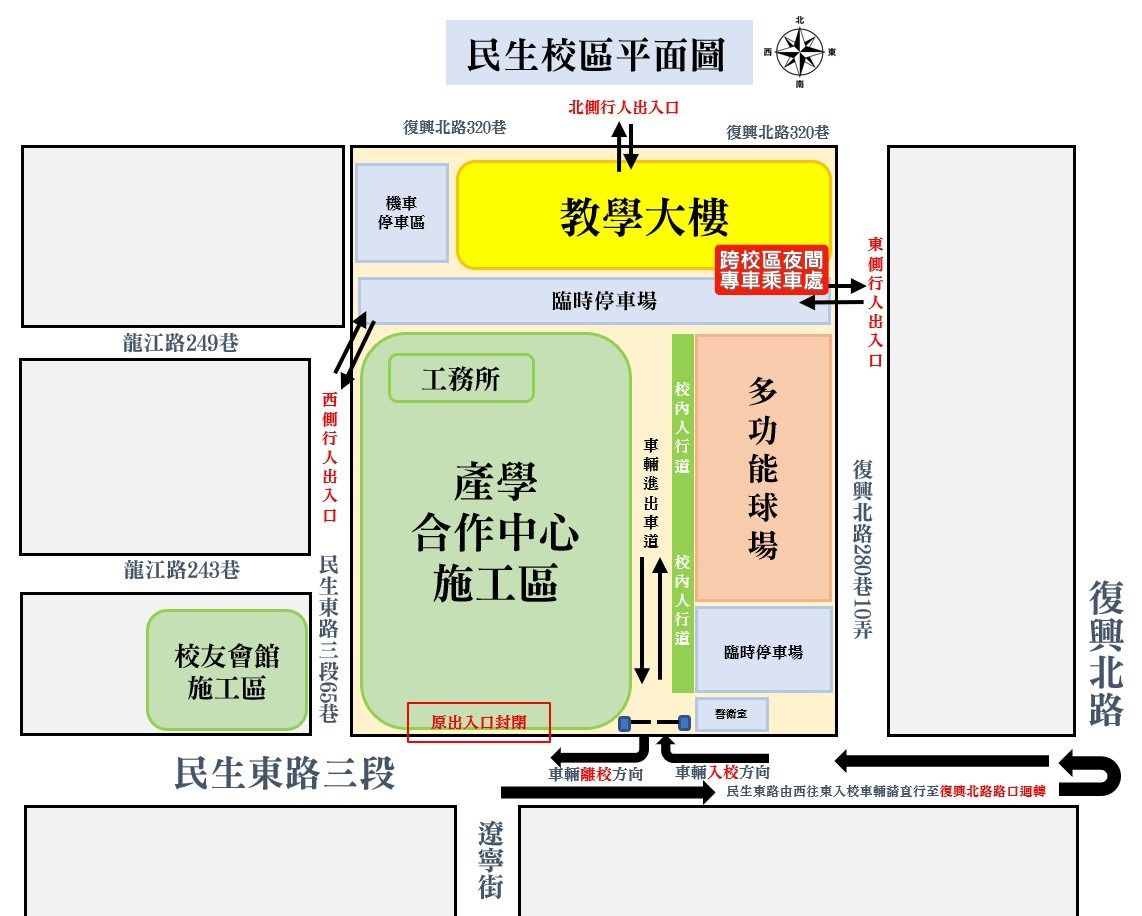 配合民生校區「臺北大道」行人及車輛出入口的改道,自 114 年 12 月起,跨校區夜間專車的乘車處將進行調整。請參考附件資訊,並提前留意乘車動線。