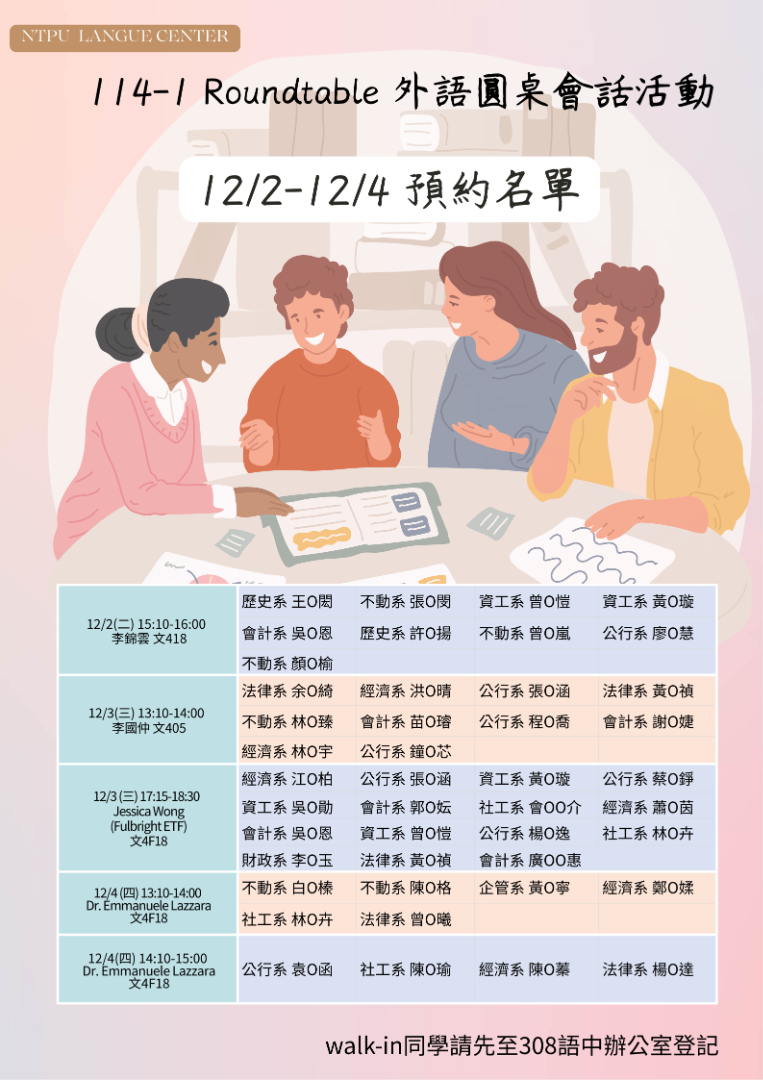 114-1 Roundtable 外語圓桌會話預約名單出爐囉!(12/2-12/4)