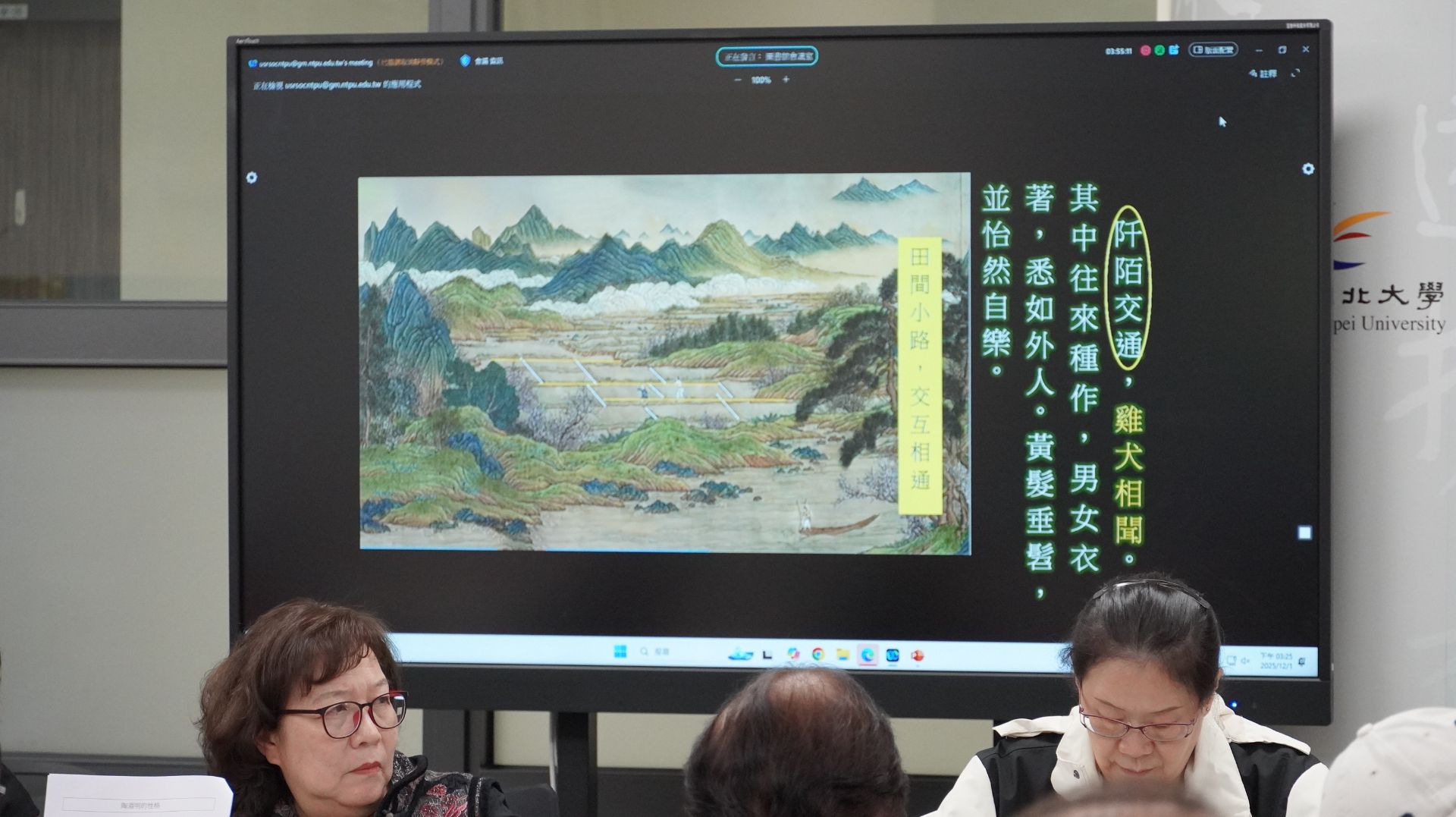 石賡執行長也透過豐富的圖片,引領學員進入《桃花源記》描述的理想國度。故事描述晉太元年間,武陵的漁人以捕魚為生,沿溪而行,「忘路之遠近」而誤入一片夾岸數百步的桃花林。他發現林盡水源處有一座山,山有小口,「彷彿若有光」,便棄船入內。最初狹窄,僅容一人通過,數十步後豁然開朗,呈現出「土地平曠,屋舍儼然」的安樂世界。桃花源裡的居民自稱是避秦時亂遷入,與外界隔絕。漁人在村中停留數日後告辭,村民叮囑他「不足為外人道也」。然而,漁人一出洞口便「處處誌之」,回到郡下後,馬上晉見太守,報告了這個地方。太守聞訊,立刻派人循著記號前往尋找,但最終「遂迷,不復得路」,故事在此留下一個開放式的結局,為讀者提供了廣闊的思考空間。