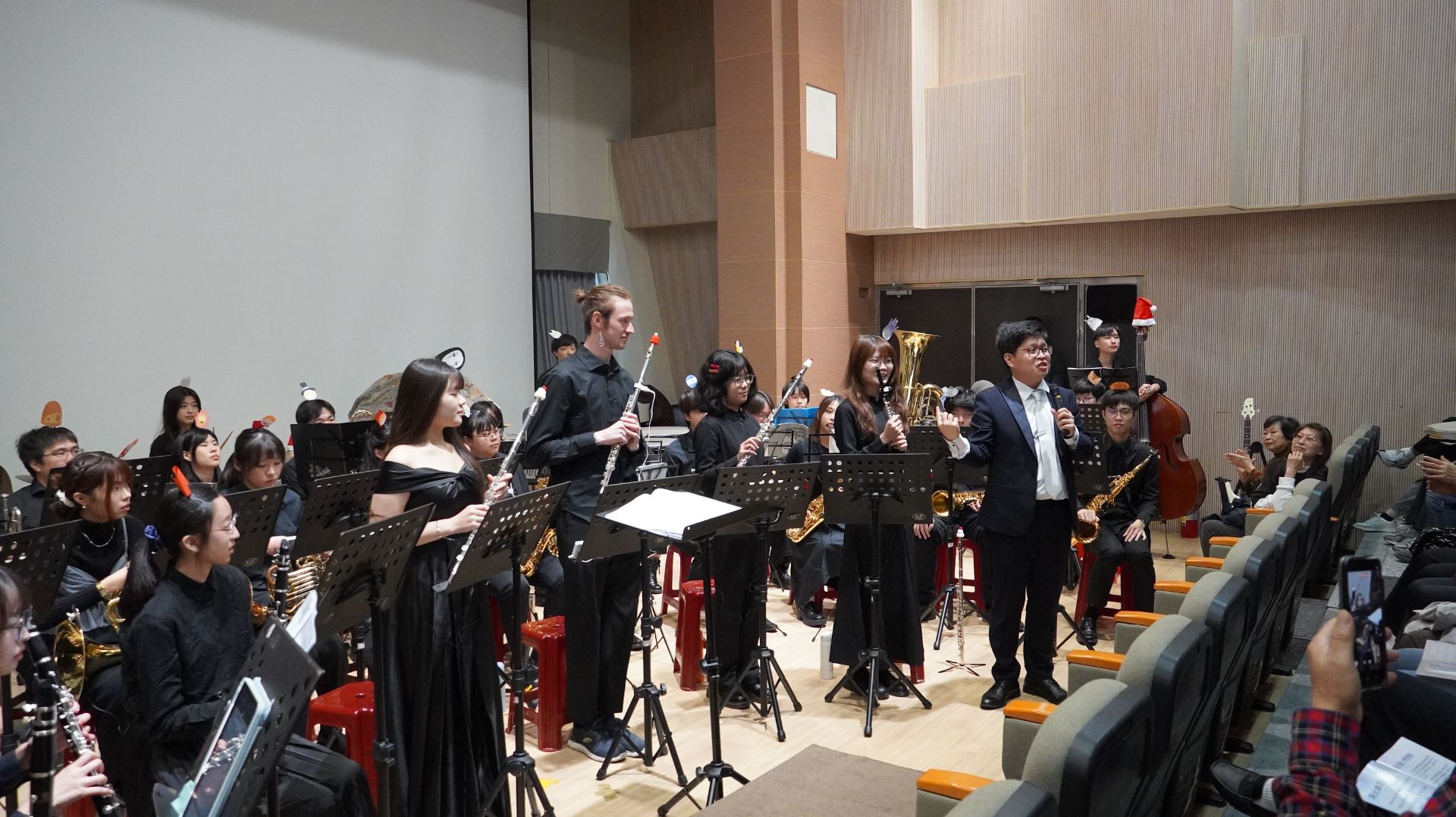 音樂可以跨越世代、穿透國界,並成為大學與在地的橋樑。第八屆北大管樂節「音畫」音樂會,於114年12月6日下午在公院119會議廳盛大舉行,這也是社科院USR計畫「大學城系列節慶」歷年來的第39場活動,累計已有超過兩萬名民眾參加。這場由北大管樂團、永續辦公室、社科院USR計畫、及台灣鳶山社會實踐協會合辦的音樂會,由於好天氣加上社區宣傳得宜,現場座無虛席,吸引近300名師生與居民觀賞,鄰近遠雄耶魯與大學京都社區也有主委和代表參與,同時USR計劃支持的「耶魯電影讀書會」,更有近40位長輩出席。透過本屆音樂的演出,不僅展現了學生的練習成果,也具體實踐了大學與社區共融的理念。