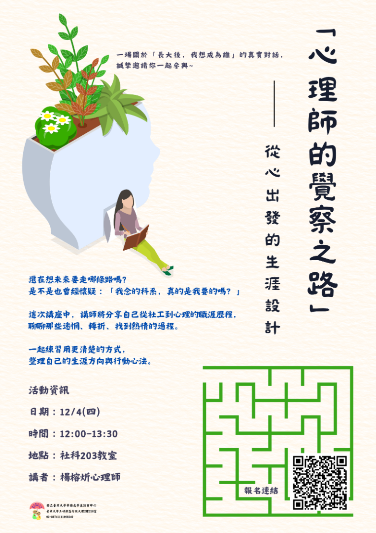 日期:114/12/4(四)時間:12:00~13:30地點:社科203教室講者:楊榕炘心理師