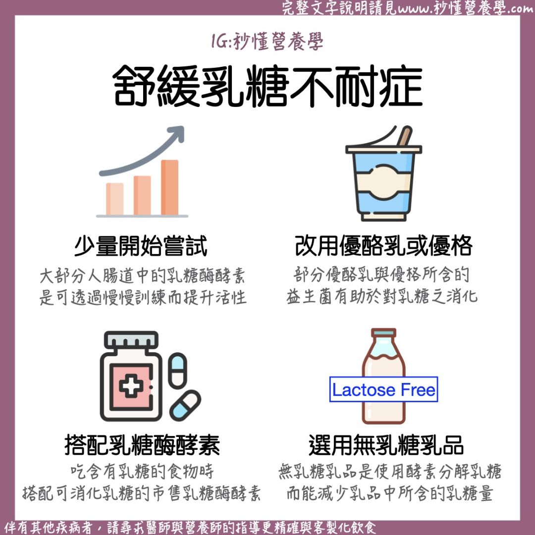 喝奶必拉肚子?營養師建議喝這種奶舒緩乳糖不耐症✅少量開始嘗試大部分人腸道中的乳糖酶酵素是可透過慢慢訓練而提升活性✅改用優酪乳或優格部分優酪乳與優格所含的益生菌有助於對乳糖之消化✅搭配乳糖酶酵素吃含有乳糖的食物時,搭配可消化乳糖的市售乳糖酶