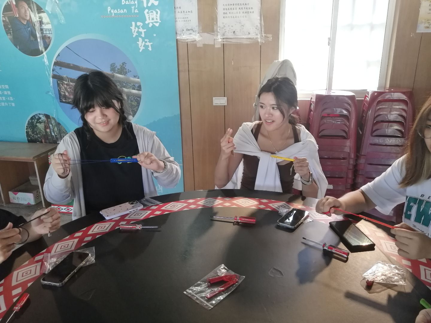 除了歷史走訪與美食體驗,活動也安排了「口簧琴手作」,口簧琴是泰雅族常用的傳統樂器,過去多用於傳遞訊息與表達情意。學生們運用壓克力板、銅片及螺絲起子製作屬於自己的口簧琴,過程中需精準調整銅片的位置,使其在吹奏時能順利產生震動聲,雖然使用壓克力材料較為便利,但學生也發現竹製口簧琴的聲音更為清脆純淨,紛紛表示未來希望能有機會學習傳統竹製口簧琴的製作方式。吹奏練習時,大家也感受到看似簡單的樂器,其實蘊含深厚的文化意涵與技巧,需要專注與用心才能奏出飽滿的音色。