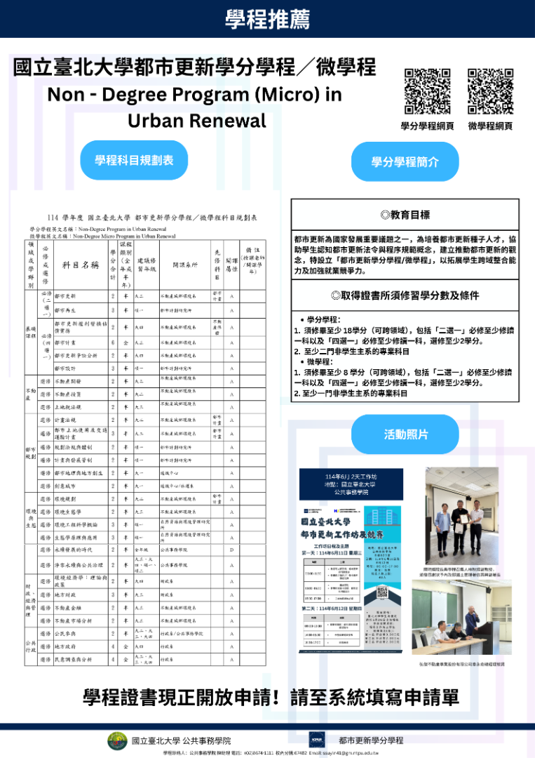 都市更新為國家發展重要議題之一,為培養都市更新種子人才,協助學生認知都市更新法令與程序規範概念,建立推動都市更新的觀念,特設立「都市更新學士學分學程/微學程」,以拓展學生跨域整合能力及加強就業競爭力。