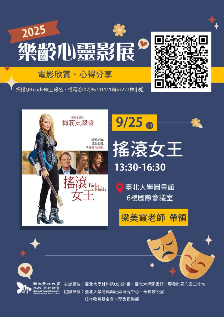 由臺北大學社科院USR計畫、任林教育基金會,與耶魯心靈工作坊合作辦理的「耶魯電影讀書會」,在任林基金會梁美霞老師與財政系楊子菡教授共同主持下,邀請社區民眾透過看電影及討論分享,以社群共學方式豐富第三人生。114年9月25日在北大圖書館六樓,繼續舉辦第26場電影欣賞,約有40位長輩一起欣賞於2015年上映,由梅莉史翠普主演的「搖滾女王」(原名 Ricki and the Flash)。該片由Diablo Cody編劇,強納森·德米(Jonathan Demme)所導演;主要演員由梅莉·史翠普(Meryl Streep)飾演女主角 Rick,凱文·克萊(Kevin Kline)飾演前夫皮特,Mamie Gummer(梅莉史翠普的真實女兒)則飾演她在片中的女兒茱莉。